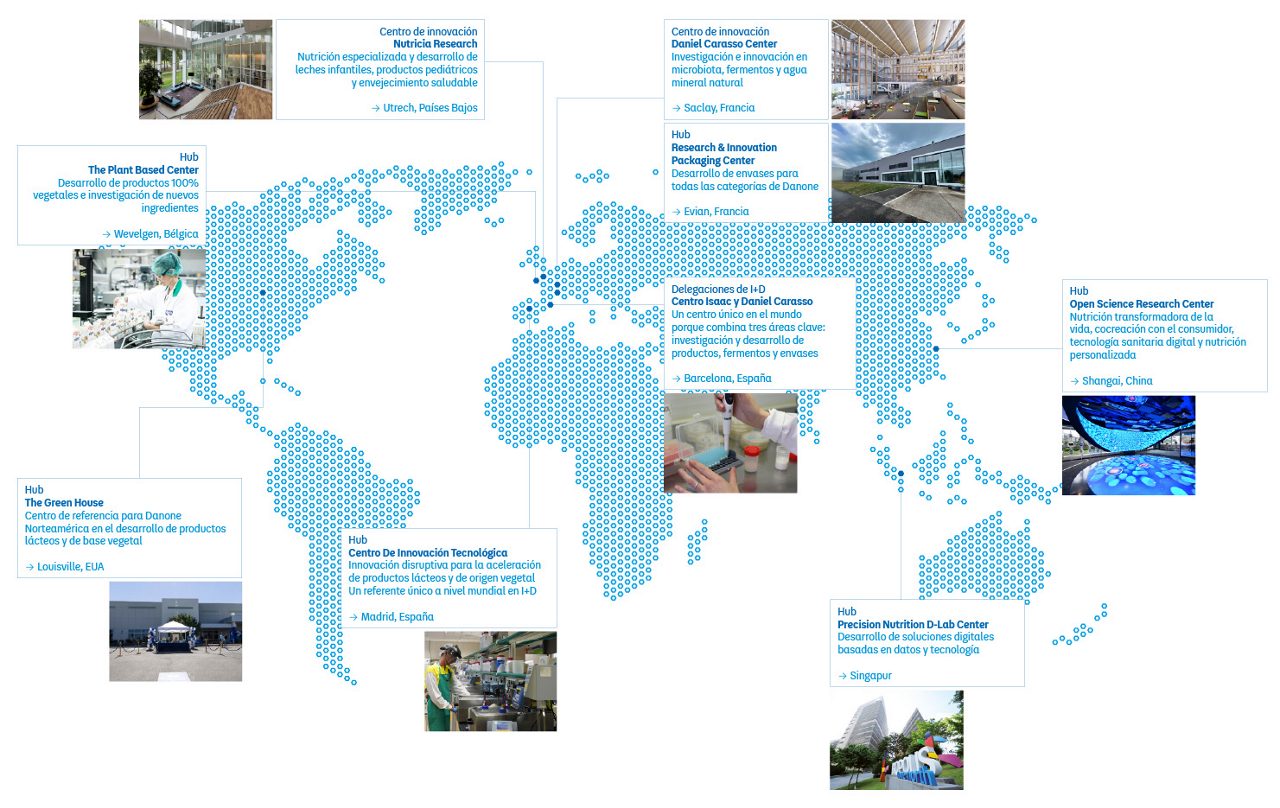En Danone, estamos redefiniendo el futuro de la alimentación, impulsados por nuestro ecosistema global de I+D. Desde nuestros dos centros globales de I+D – ubicados en París-Saclay (Francia), y en Utrecht (Países Bajos) - lideramos la innovación en productos lácteos esenciales, productos de origen vegetal, agua mineral y nutrición especializada. Además, contamos con 6 hubs especializados, entre los cuales se encuentra nuestro Centro de Innovación Tecnológica de Tres Cantos, Madrid. Por último, nuestra red incluye 55 delegaciones locales, como nuestro Centro de I+D Isaac y Daniel Carasso, ubicado en Barcelona.
